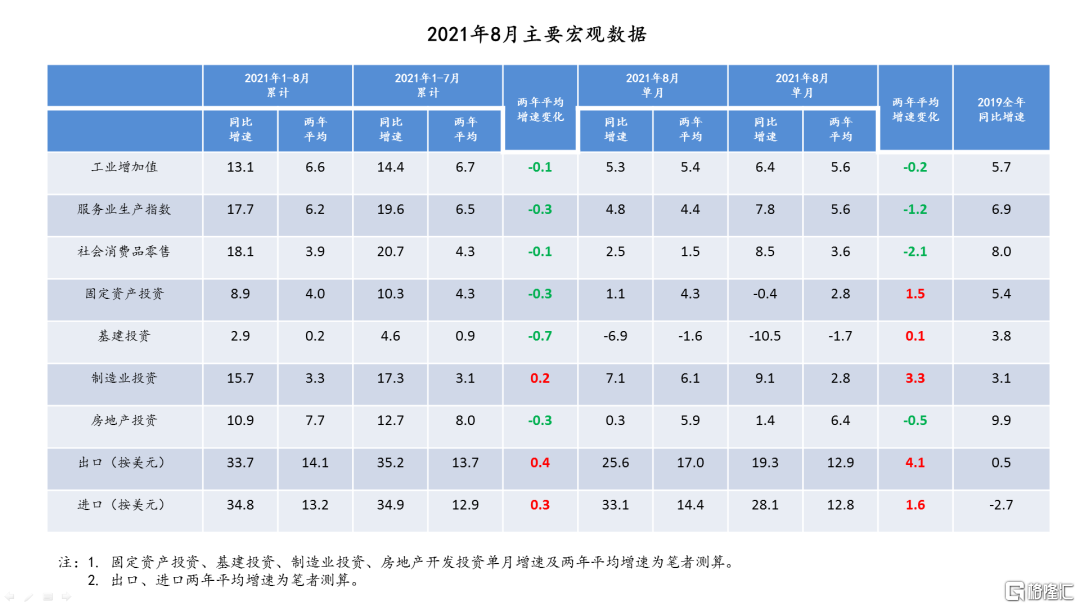 8月以来,由于国际疫情蔓延,全球供需失衡状况进一步加剧,订单转移效应推动我国出口超预期好转,但国内由于疫情防控措施加码,服务业和消费受到较大冲击,导致内需明显回落。整体来看,8月经济下行压力继续加大,除出口外的多数指标弱于市场预期且较上月继续回落。