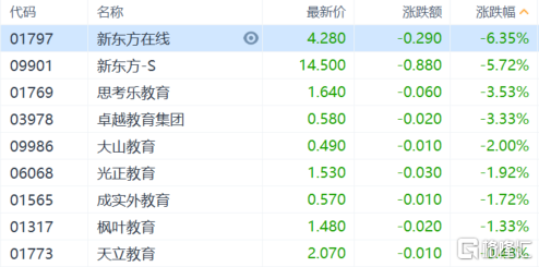 教育股跌幅居前。新东方在线跌超6%,新东方-S跌近6%,思考乐教育、卓越教育等跟跌。