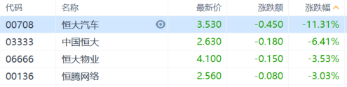 恒大概念股再度走低。恒大汽车跌超11%,中国恒大跌超6%,恒大物业、恒腾网络跌超3%。