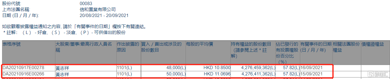 信和置业(00083.HK)获执行董事黄志祥增持9.8万股