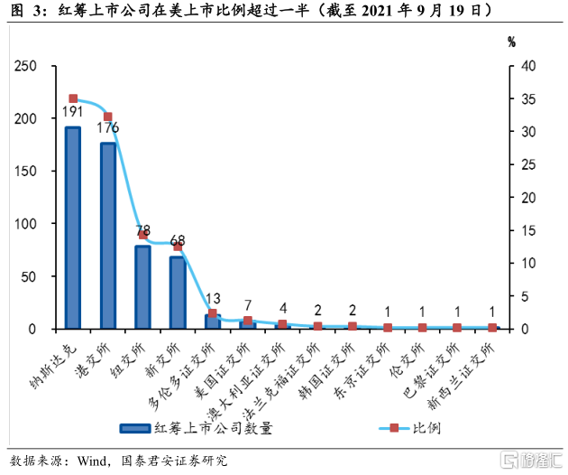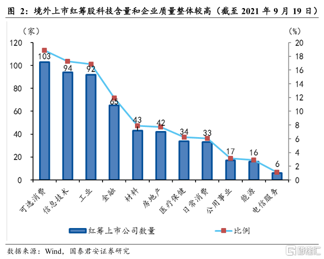 第二,红筹回A有助于发挥股票市场财富效应,对于助力共同富裕有积极作用。我国股票市场财富效应尚不显著,并且存在一级、一级半、二级市场的明显分化,二级市场的财富效应并未充分发挥。对比美国,美国货币政策虽然宣称不内生于资本市场,但是从其表现来看,确实对资产价格作出反应,主要是因为美国的养老金、共同基金以及居民财富多数投资于证券市场,而证券市场通过吸引世界的优质企业,为其资本创造高额收益。截至2021年9月19日,中国在境外上市的红筹企业达到545家,其中可选消费、信息技术、工业三大行业数量居多,可选消费中涵盖小鹏、理想、京东、阿里等新能源汽车和互联网零售企业。相对而言,境外上市的红筹企业大多数标的优质、科技含量较高,当前的回A试点为“优中选优”,其对于促进我国资本市场长期价值稳定增长具有重要意义,从而让更多境内居民分享增长红利。