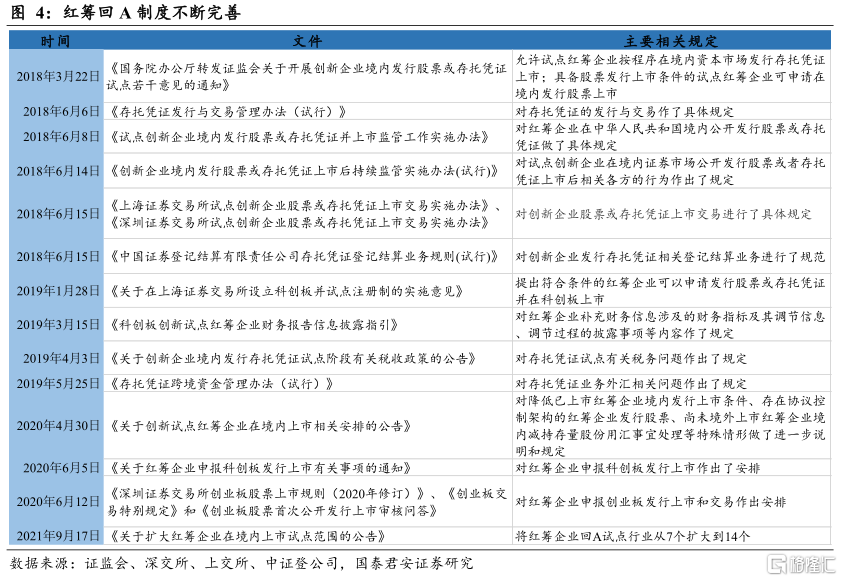 2)红筹回A将进入一波加速期。红筹回A制度不断完善,已确定A股模式和CDR模式两种方式,目前已有4家企业完成回A发行,但是回A依旧面临资本市场包容性、科技属性要求等限制,前期进程较慢,随着试点行业范围扩大、美国打压持续以及赴境外上市监管加强,预计红筹回A将迎来一波加速期。