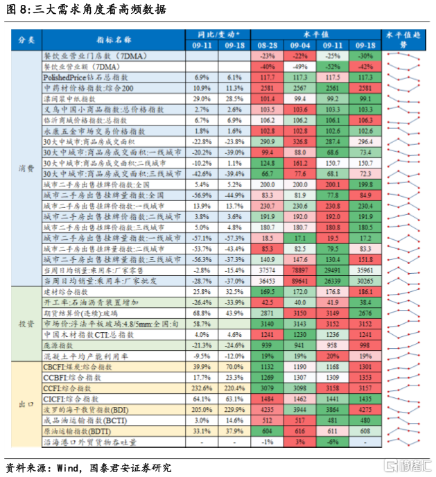 从需求端角度来看,地产销售继续下跌,基建投资出现回升迹象,餐饮消费、乘用车销售有所改善,外需稳中向好。