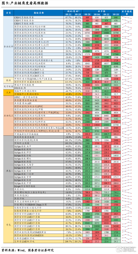 消费:房地产销售继续下跌,乘用车销量环比小幅回升。9月18日当周,地产销售稍微回升,一、三线城市商品房成交面积继续下跌,二线虽然同比转正,但涨幅仅为1.1%。餐饮消费出现一定回暖迹象,营业门店数继续减少但营业额提升。各类商品价格基本和上周持平,中药材略涨,钻石微跌。