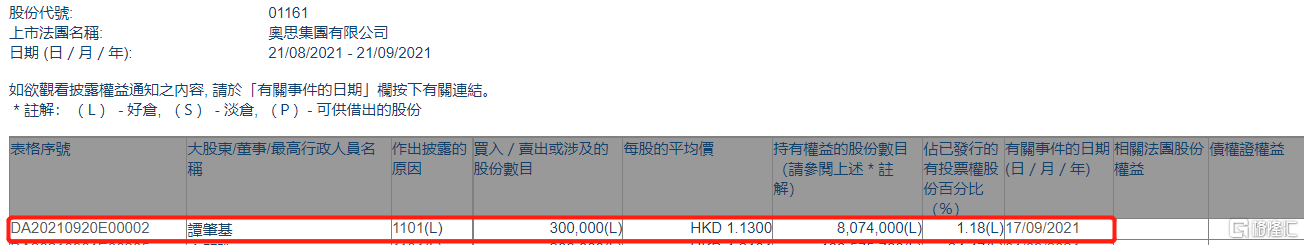 奥思集团(01161.HK)获行政总裁谭肇基增持30万股
