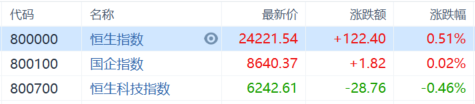 今日,港股止跌反弹,恒指尾盘拉升上扬,收涨0.51%报24221点,国指涨0.02%报8640点,恒生科技指数跌0.46%报6242点。