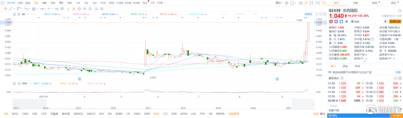 个股方面,京西国际涨25.3%,报1.04港元,创两年半新高,总市值5.97亿港元。消息面上,京西国际发布公告,京西重工确认母公司将会于2021年9月22日在北交所网站就产权转让交易作出信息正式披露,有效期为以北交所网站发布信息正式披露公告次工作日为起始日起的二十个工作天,即由2021年9月23日起至2021年10月25日止,包括首尾两日。信息正式披露的具体内容及详情包括但不限于该潜在交易的条款、潜在投标人的资格规定以及公开招标的程序及条件等。