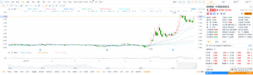 中国能源建设涨超11%,报1.58港元总市值达650亿港元。日前公司再度披露关于换股吸收合并葛洲坝换股实施结果、股份变动的公告。此前,拟换股吸收合并葛洲坝已获证监会核准,公司A股上市已经临近。国泰君安此前表示,对公司的前景保持乐观的看法并相信公司的增长将在其A股上市后进一步加速。