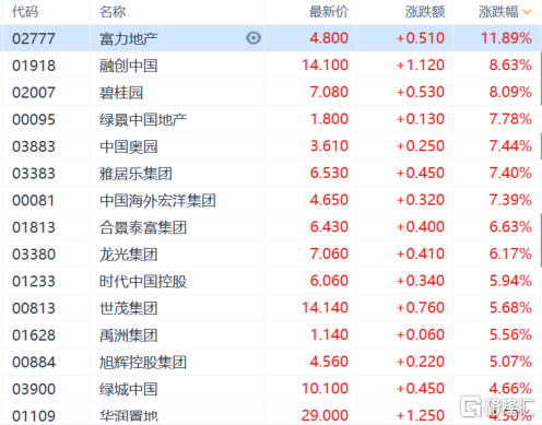 内房股反弹。富力地产涨近12%,融创中国、碧桂园涨超8%,绿景中国地产、中国奥园、雅居乐集团涨超7%,合景泰富集团、龙光集团涨超6%,时代中国控股、世茂集团、禹州集团、旭辉控股涨超5%,绿城中国、华润置地等涨超4%。