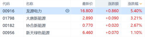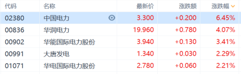 电力、风电板块涨幅居前。中国电力涨超6%,龙源电力涨超5%,华润电力涨超4%,华能国际电力股份、大唐新能源涨超3%,协和新能源、大唐发电等涨超2%。
