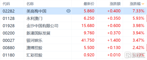 博彩股大涨。美高梅中国涨超7%,永利澳门涨近6%,金沙中国、新濠国际发展涨近4%,银河娱乐涨超3%,澳博控股涨超2%。