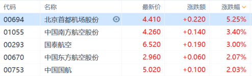 航空股走强。北京首都机场股份涨超5%,中国南方航空、国泰航空涨超3%,中国东方航空、国航涨超2%。