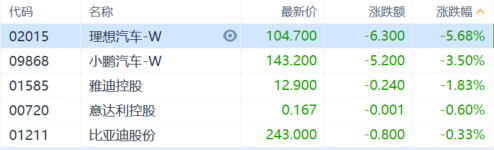 汽车股跌幅居前。理想汽车跌超5%,小鹏汽车跌3%,雅迪控股、比亚迪股份等跟跌。
