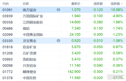 有色金属股延续跌势。南方锰业跌超10%,万国国际矿业跌近5%,详细铜业、俄铝、中国黄金、灵宝黄金跌超1%,五矿资源、赣锋锂业等跟跌。