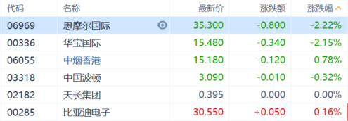 烟草概念股走弱。思摩尔国际、华宝香港跌超2%,中国香港跌0.78%,中国波顿跌0.32%。