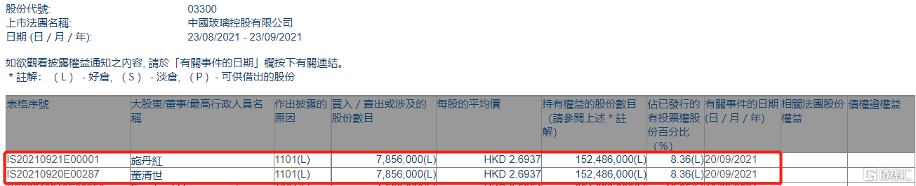 中国玻璃(03300.HK)获股东施丹红增持785.6万股