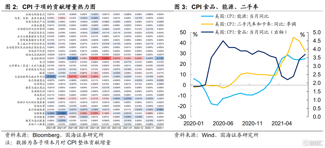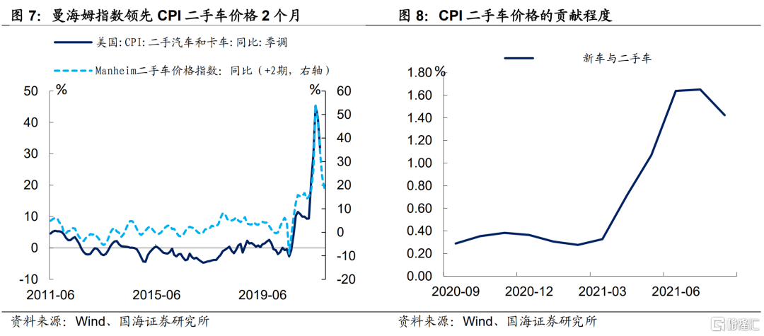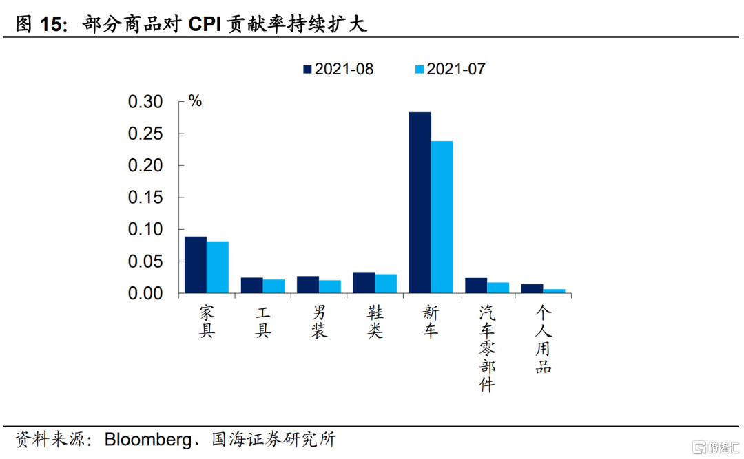 (2)通胀上涨最快的时候已经过去。二手车辆和其他耐用品价格已经稳定,耐用品涨价因素已经很难成为推升通胀继续走高的原因;