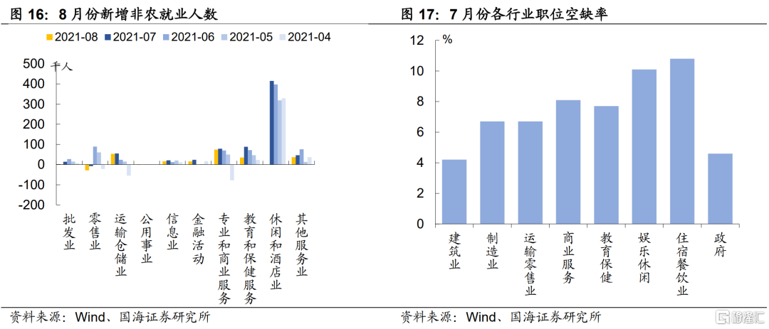 供给瓶颈不仅出现在货运上,劳动力市场也面临供不应求的尴尬局面。我们认为,薪酬价格的现象或许在某些行业上已经有所体现8月份美国劳动力市场的恢复进程差强人意,就业形式最严峻的行业依旧集中在娱乐休闲和住宿餐饮等接触性服务业。