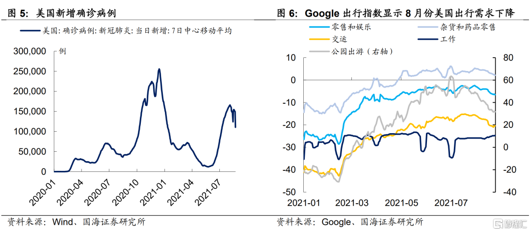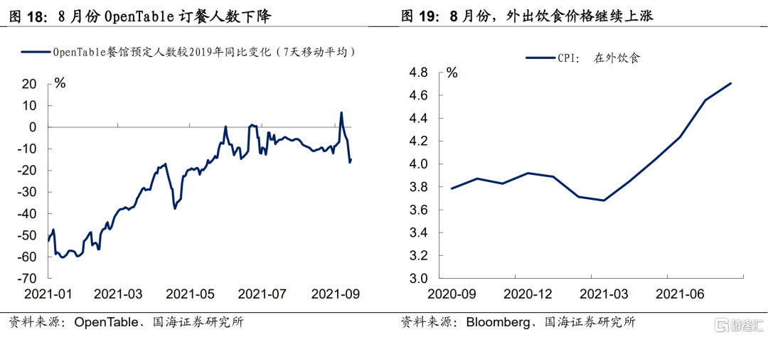 在劳动力缺口持续扩张的格局下,服务业涨薪幅度显著,涨价现象或许已经开始向餐饮消费进行传导。8月份,受疫情影响,外出就餐人数下降,而外出餐饮的价格涨幅仍在扩大,这或许表明前期餐饮业招工难导致的薪酬涨价因素,以及美国国内供应链紧张等问题,正在造成餐饮业运营成本上升,从而向消费者进行传导。