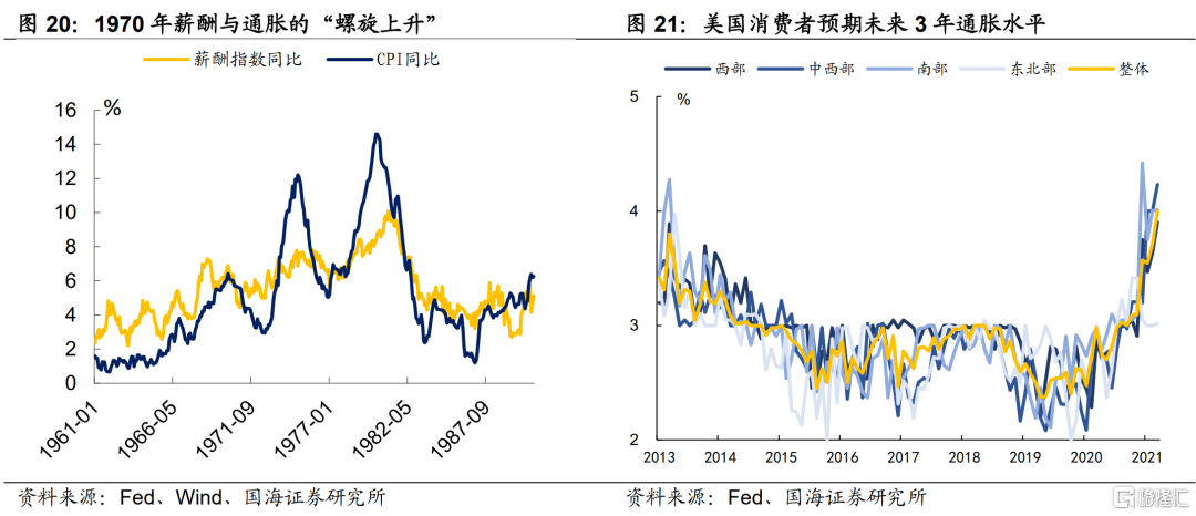 (1)本轮美国通胀是结构性的。不同于1970年代的大通胀,本轮美国通胀并非“大水漫灌”,涨价现象出现在那些受疫情影响最重的行业,在经济恢复的进程中这些商品的需求恢复最快,涨价也最快;