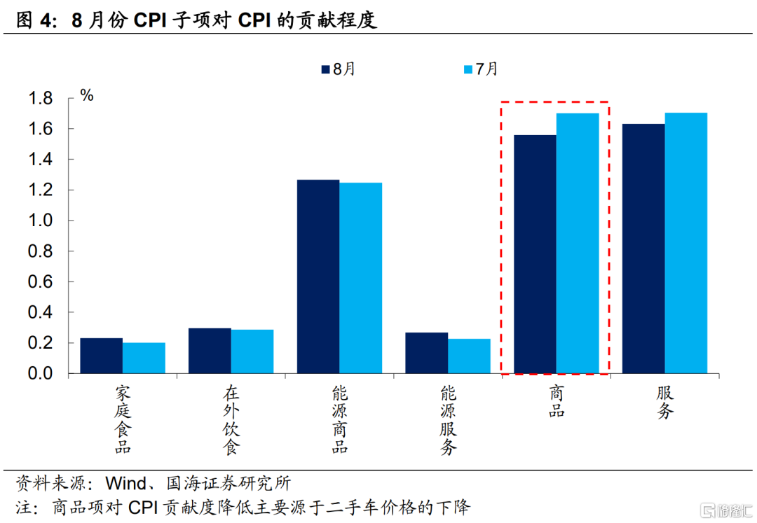 曼海姆二手车指数领先CPI二手车价格同比增速2个月左右,自6月份抵达高点后,已经有所回落。根据目前数据来看,未来2个月CPI二手车价格项有进一步回落空间。