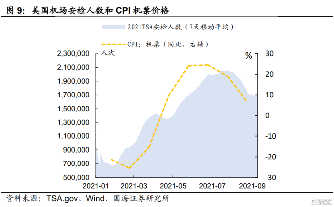 与此同时,出行需求的下降也使得以机票价格为代表的出行相关项价格受到了一定程度的冲击。从美国TSA机场安检人数来看,8月份受疫情影响,机场安检人数大幅下降,表面美国居民在8月份的出行需求下降,从而也使得CPI产生了一定的下行压力。