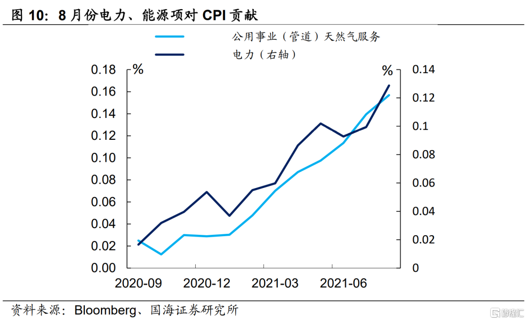除了出行相关项的价格下降外,8月份的价格数据中也能看到一些项目的价格小幅上涨,其中,能源价格的扰动再一次出现。8月份飓风艾达的侵袭造成了美国南部海湾的油井停工停产,从而推升了以电力为代表的能源服务相关项的价格增长。