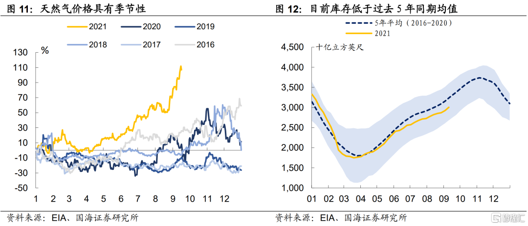 不同于今年年初由原油推动的通胀,这次能源“卷土重来”的压力来自于天然气。美国天然气需求具有季节性,通常而言,夏季至秋季是天然气开采的累库期,用于应对冬天的用电高峰。受飓风影响,今年累库进程受到显著影响,天然气库存显著低于过去5年均值。这意味着,今年冬天美国的电力使用环境更易受到极端天气的影响,从而对CPI上行有潜在威胁。