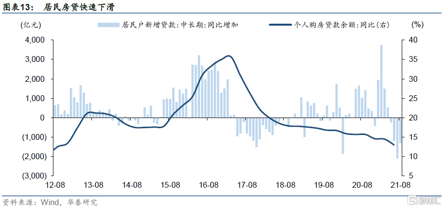对于商业银行,面临坏账风险、融资需求下滑等冲击,风险偏好降低,缺资产问题加剧。根据财报数据,2021年中报披露了房地产业贷款不良率的24家A股上市银行中,有16家涉房贷款不良率较去年底有所提升,今年下半年压力更大。不过涉房贷款有抵质押物覆盖,在楼市不出现风险传染情况下,坏账损失可能较小。但如前述,沿着房地产链的行业经营情况都受波及,经济下行仍将造成银行坏账风险整体提升。一来融资需求主动与被动下降,二来金融机构风险偏好降低,减少涉房业务投放等,资产荒情况也可能加剧。