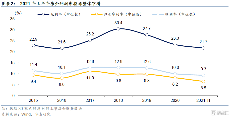 其一,目前的土拍机制下,企业不赚钱,拿地动力不足。过去土拍多采取“限房价、竞地价”或“限房价、限地价+竞自持与配建”的方式,自持与配建本质也提高房企隐性成本。“售价锁定、成本攀升”正令房地产行业变得无利可图,集中供地又加剧了土拍市场分化和行业内耗。如前述,第一轮拍地出现“高溢价、高流拍”并存特征。根据公司财报数据,2021年上半年80家典型上市房企利润率指标整体下滑,净利率和归母净利率的中位数降至9.3%和6.5%,为2015年以来新低。重点城市第二轮土拍规则调整后,溢价率被限制且下调、多数城市也取消了竞自持配建等要求改为竞品质或摇号,这些措施有利于改善房企利润,但拿地门槛提高与销售预期变差使得土地流拍更加严重。