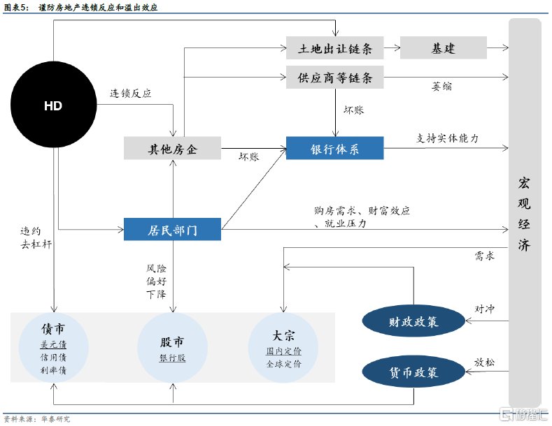对于房企,“融资收紧、回款下滑->债务风险->评级下调->金融机构对地产授信更谨慎”或形成恶性循环甚至预期自我实现;对于房地产链行业,既面临需求下滑等经营压力,也出现应收款难以回笼、再融资难度加大等流动性困境;对于居民部门,交房不确定性增大、房价预期转负面,并且房地产链的就业和收入受冲击,购房与消费意愿都受抑制;对于商业银行,面临坏账风险、融资需求下滑等冲击,风险偏好降低,缺资产问题加剧;对于地方政府,土地财政面临压力,基建更加缺少资金来源。我国居民资产负债表健康,阻挡负反馈的关键在于稳定房价,个别房企问题引发系统性风险的概率小。