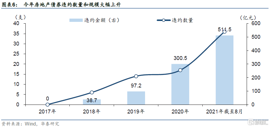 首先对于房企,谨防“融资收紧、回款下滑->债务风险->评级下调->金融机构对地产授信更谨慎”或形成恶性循环。据Wind统计,今年房地产债券违约数量和规模大幅上升。2019年房地产业构成实质违约或展期或触发交叉条款的债券数量为14只,涉及债券规模为97.2亿元;2020年为17只,涉及规模升至300.5亿元;2021年截至8月底,已有36只涉房债券违约,涉及规模达511.5亿元。债务风险发酵背景下,即便经营状况良好房企的融资也难免受波及,其中,中资美元债可能是重灾区,还可能影响人民币汇率。
