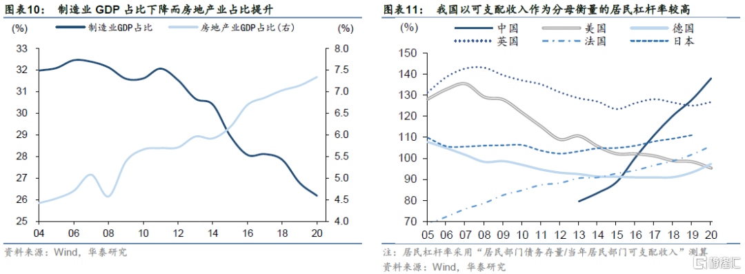 一是限制金融资源被房地产过度挤占、高房价挤出实体利润与消费潜力。我国房地产GDP占比自商品房时代以来持续提升,而与之形成反差的是制造业GDP占比在近十年较快下滑,过去地产依赖型发展模式,造成了社会资源配置不合理、经济结构扭曲等问题,对其他产业发展、居民消费增长,已经由挤入效应变为挤出效应,摆脱地产依赖成为必然选择;