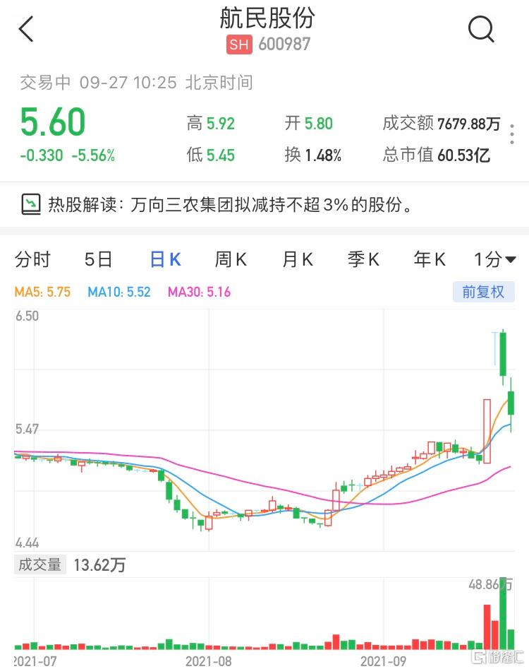 A股异动 | 航民股份(600987.SH)跌逾5% 万向三农集团拟减持不超3%公司股份
