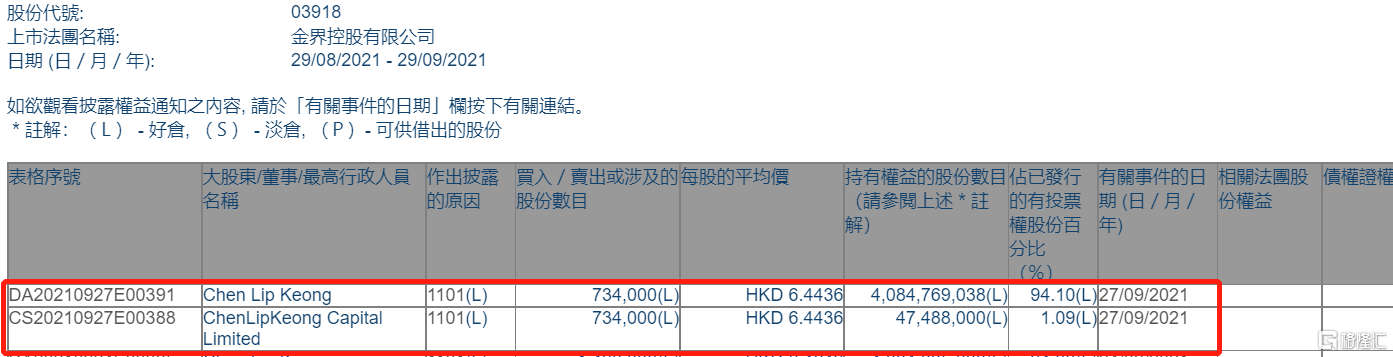 金界控股(03918.HK)获Chen Lip Keong增持73.4万股