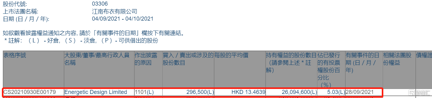 江南布衣(03306.HK)获Energetic Design增持29.65万股