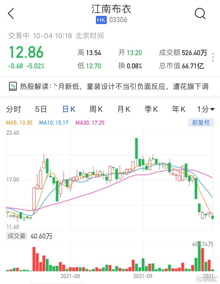 格隆汇10月4日丨江南布衣(3306.HK)低开低走,盘中低见12.7港元创7月14日以来逾2个月新低,现跌5.02%报12.86港元,最新市值66亿港元。花旗近日发报告指,料江南布衣30日内股价将跌,主要由于其童装设计存在问题而引起负面公众反应。虽然江南布衣已于社交平台小红书上致歉并收回有问题产品,并指相关系列为2017年款式,对收入影响轻微,但该行关注消费者对品牌感觉的后续影响,相信对其童装及整体品牌的季节性销售将造成影响。该行下调明年江南布衣销售预测,童装及整体品牌的销售增长自原先的12%分别下调至仅得1%及9%增长,每股盈利预测下调4%,目标价相应自20.5港元下调至19.5港元,惟因估值仍然吸引,评级维持“买入”。