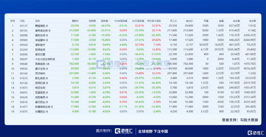 其中,疫苗概念股跌势尤为惨烈。康希诺、腾盛博药盘中一度暴跌逾26%,开拓药业暴跌近24%,复星医药暴跌逾21%,中国生物制药跌逾6%。在疫苗股的带动下,其他医药股也均下跌。再鼎医药跌逾7%,百济神州跌近5%,君实生物跌近3%。