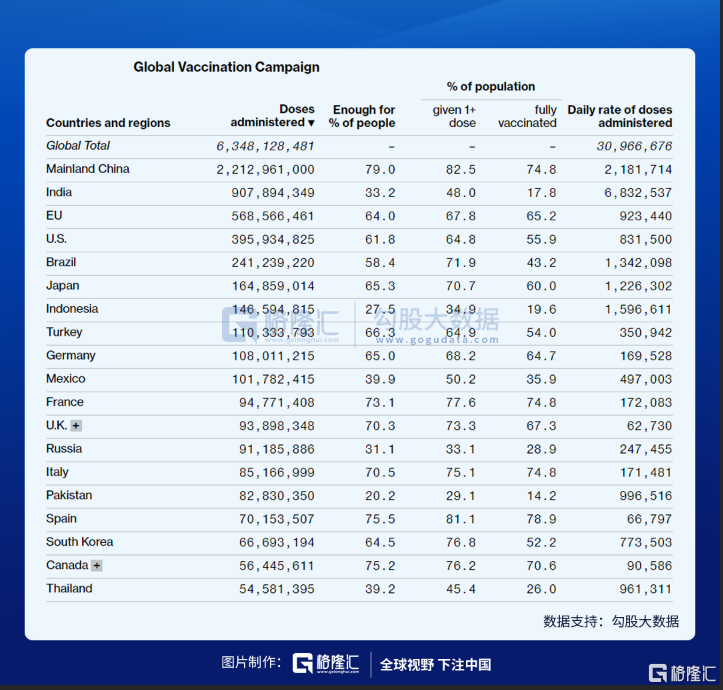 彭博社最新数据显示,目前全球已经有超过184个国家注射了总计超63.4亿剂次新冠疫苗,疫苗接种率达到41.3%。最新的注射频率达到了平均每天约3.1千万剂次。彭博社预计,如果按这个接种速度,只需要6个月,接种新冠疫苗的人数就能占到全球总人口的75%。