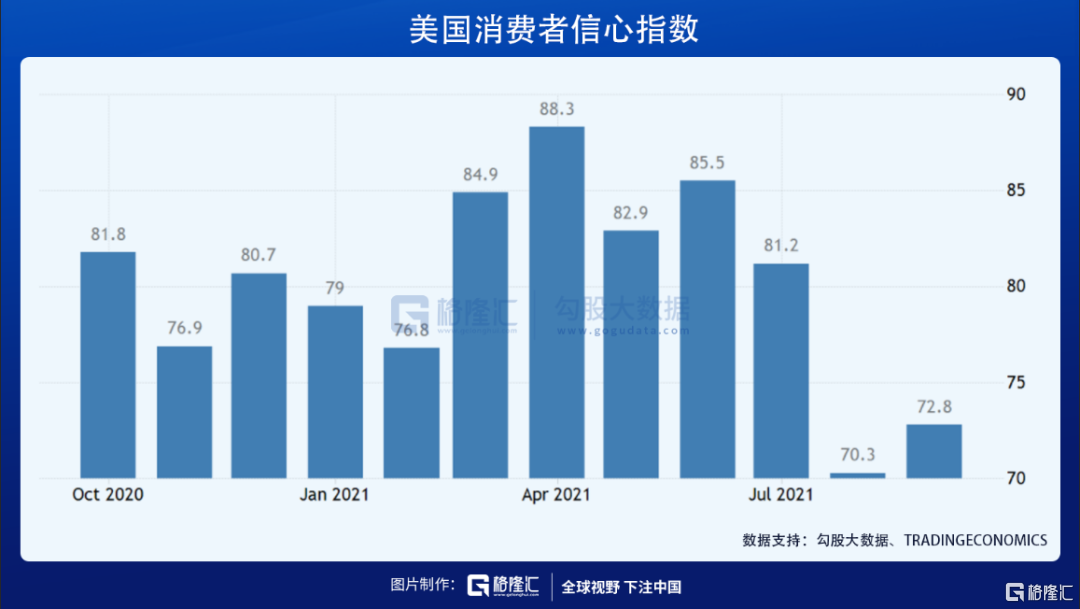 目前,国内疫苗接种率已经高达79%。特效药的出现,在高接种率的国家或许应用场景更窄。但在美国等海外国家,却能够起到更快控制疫情作用,尤其是在变异病株德尔塔病毒迅速传播的当下。受此影响,美国的消费者信心指数仍然处于低迷状态。