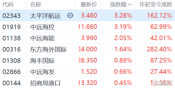 港股异动 | 海运股开盘上涨,中远海控(1919.HK)涨超3%