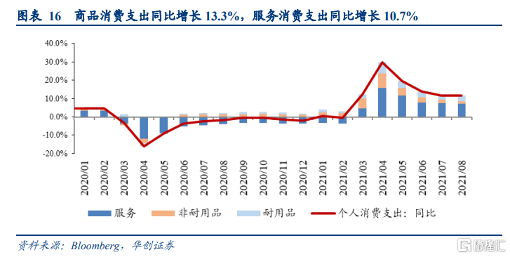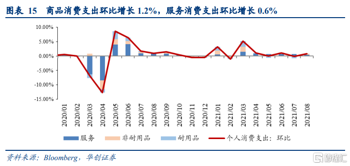 环比来看,受疫情影响,商品消费支出反弹,服务消费支出增速放缓。8月商品消费支出增长1.2%(前值-2.1%),拉动个人消费支出增长0.42个百分点。商品中,除汽车消费支出下降外,其余耐用品分类的消费支出反弹;汽油及其他能源品支出增长放缓,其余非耐用品消费支出有所反弹。服务消费支出增长0.6%(前值1.1%),拉动个人消费支出环比增长0.41个百分点。服务里面,居住和医疗消费支出增长加快,与出行和社交相关的交通服务、食品服务及住宿、娱乐服务消费支出增长放缓。
