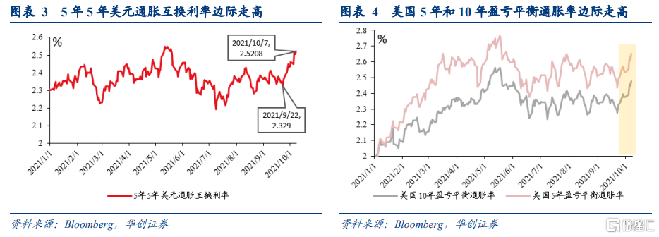 金融市场利率隐含的通胀预期边际升温,显示出市场参与者正在正向定价美联储官员对未来通胀的担忧。9月22日美联储议息会议后至月底,美国金融市场交易的通胀预期有一波快速上升,幅度约为10bp左右,5年5年美元通胀互换利率从2.329%上升至2.437%,5年和10年盈亏平衡通胀率从2.437%、2.777%升至2.533%、2.376%。国庆期间,多位美联储官员表达了对未来通胀的担忧,金融市场交易的通胀预期再次快速上升,幅度大约为在8-11bp之间,5年5年美元通胀互换利率从2.437%上升至2.521%,5年和10年盈亏平衡通胀率从2.533%、2.376%升至2.651%、2.476%。