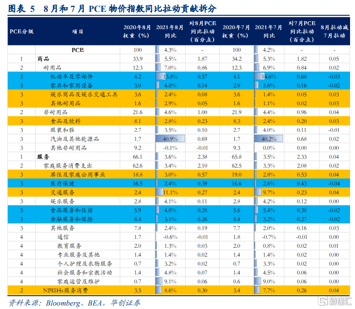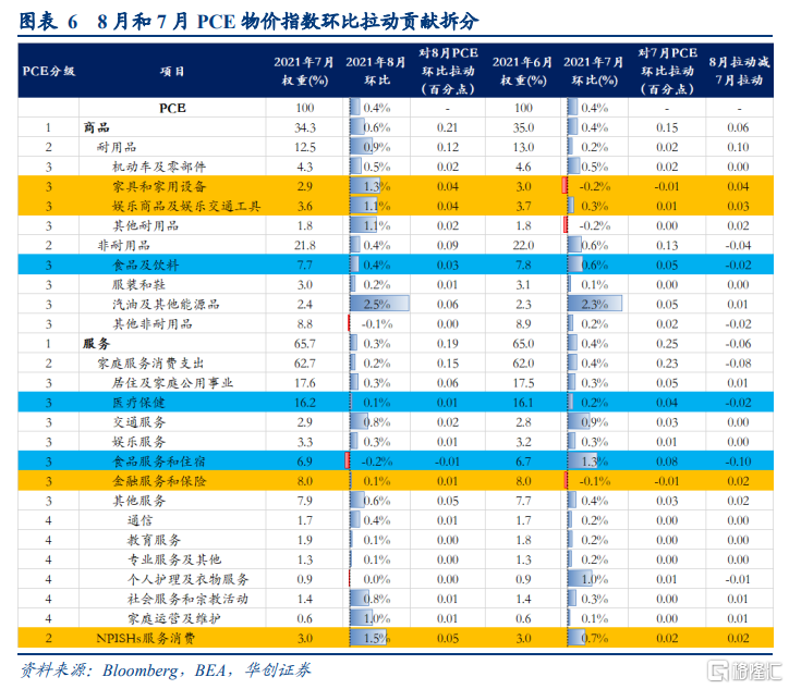 环比来看,8月PCE物价指数环比0.4%,前值0.4%,主要的额外拉动项是家具和家用设备、娱乐商品和娱乐交通工具、金融服务和保险、NPISHs服务消费,合计额外拉动PCE物价指数环比0.12个百分点。而食饮、医疗保健、食品服务和住宿,合计额外拖累约0.14个百分点。