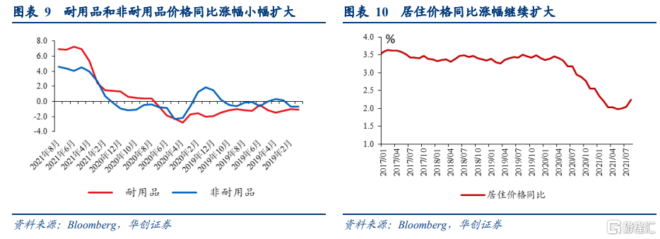 耐用品中,机动车及其零部件(13.8%)、家具及家用设备(4.8%)价格涨幅较上月回落0.8和0.8个百分点;音响影音设备、信息设备、自行车等带动娱乐商品及娱乐交通工具(2.4%)价格涨幅扩大1个百分点,珠宝手表、医疗设备等带动其他耐用品(2.9%)价格涨幅扩大1.8个百分点。非耐用品中,食品饮料(2.8%)、汽油及其他能源品(40.9%)价格涨幅分别扩大0.4和0.7个百分点,服装和鞋价格(3.5%)涨幅回落0.5个百分点。