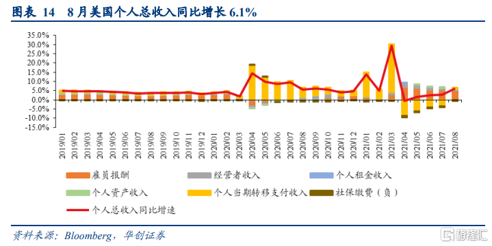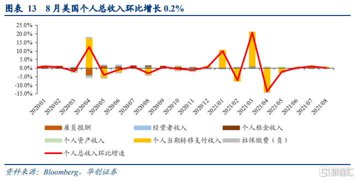 8月美国个人总收入(季调折年数,下同)约20.7万亿,环比增长0.2%,同比增长6.1%。个人可支配收入约18.1万亿,环比增长0.1%,同比增长4.5%。8月个人总收入环比增长主要来自私人工资和薪水的贡献。个人当期转移支付收入增长大幅下滑,主要系政府福利中的失业救济金减少导致,但“美国救济计划”中的儿童税收抵免措施部分抵消了该项收入损失。