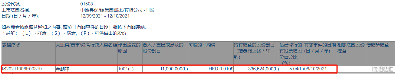 中国再保险(01508.HK)获股东蔡朝晖增持1100万股