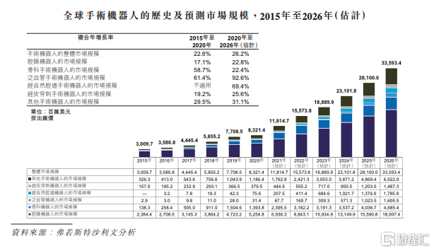 根据弗若斯特沙利文的资料,中国手术机器人市场将由2020年的4亿美元增至2026年的38亿美元,年复合增长率为44.3%。而预期全球市场将由2020年的83亿美元扩大至2026年的336亿美元,复合年增长率为26.2%。