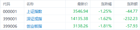 10月12日,两市午后继续下行,三大指数一度均跌超2%。截止收盘,沪指跌1.25%报3546点,深成指跌1.62%报14135点,创业板指跌1.81%报3138点。