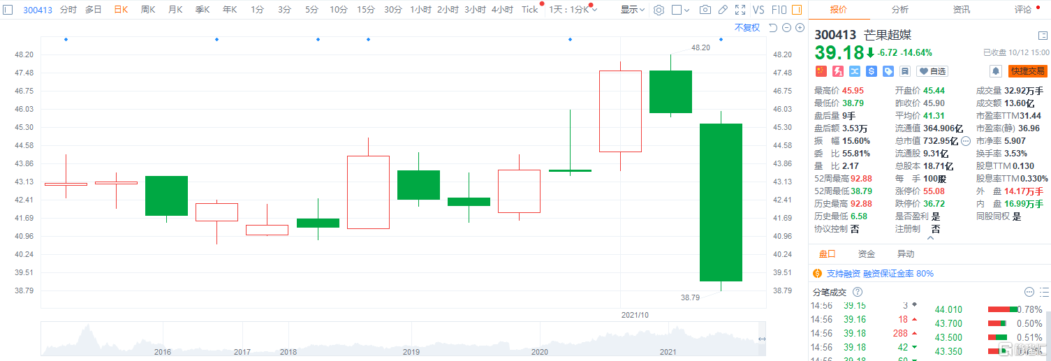 芒果超媒跌14.64%报39.18元,市值732.95亿元。10月9日,湖南卫视官方微博表示,周六晚黄金档《快乐大本营》升级改版、更新换代。湖南卫视官方发布的节目单,确定9日晚播出的《快乐大本营》被叫停。作为湖南广播电视台控股的上市公司,“背靠”湖南卫视的芒果传媒最近两个交易日累跌超12%,市值蒸发逾百亿。